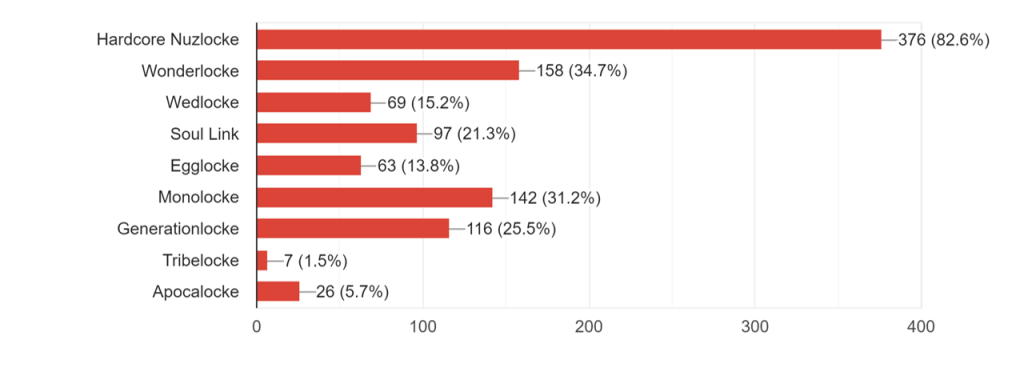 With 82.6% of respondents having tried the Hardcore Nuzlocke at least once, it’s the most commonly-played Nuzlocke variant, more than doubling its nearest competition the Wonderlocke. This may be due to its straightforward and simple approach to difficulty, without lots of gimmicky or complex changes that can sometimes be found in other variants, as well as due to its popularity on YouTube and Twitch – especially with Pokémon Challenges who formalized and popularized the ruleset.