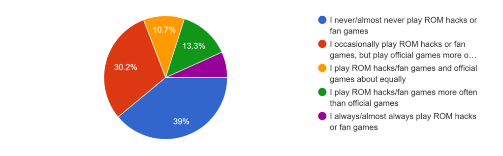 It seems like, for most of our respondents, the officially published games are king. 39% of respondents said they never or almost never play ROM hacks or fan games, with another 30.2% playing them occasionally but less often than official games. 10.7% play ROM hacks and official games about equally, and the remainder is split between those who play ROM hacks somewhat more often (13.3%) and those who always or almost always play ROM hacks (6.8%). So while the official games are the go-to for the majority of players, there’s still a strong group of respondents who really enjoy the different experiences fan games and ROM hacks provide.