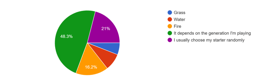 According to our survey, most players don’t have a favorite starter type, with 48.3% saying their choice depends on which game they’re playing and 21% saying they randomize their choice. The remainder is split between Fire (16.2%), Water (8.5%), and Grass (5.9%). This makes sense – different generations have different encounter tables and Gym Leader lineups, making the optimal choice dependent on the generation being played. Fire-type Pokémon tend to be rare, especially in early generations, making Fire starters valuable.
