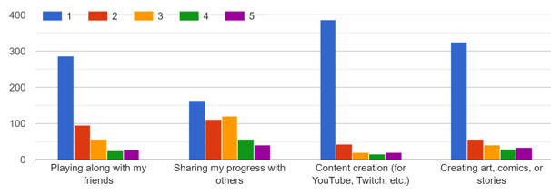 Getting ideas for new rulesets is the winner, with both the most “five” votes and the most points in total. General strategy, tips, and tier list discussion are a close second, with seeing run updates from other players – the first primarily social factor – following at third. After that we see a pretty significant drop-off to fourth place and beyond, with many fewer players asking for specific advice or sharing their own run updates. It’s interesting to see that the average respondent cares much more about seeing others’ run updates than sharing their own, though it does align with the popularity of let’s plays and Nuzlocking videos and Twitch streams – many players seem to enjoy watching or following runs as much as they enjoy actually playing.
