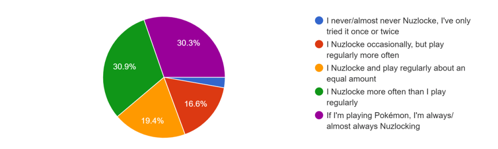 The results here are pretty conclusive, but there are still a couple of interesting surprises here, so let’s take a look. For starters, it’s clear that the majority of respondents spend most of their Pokémon play-time Nuzlocking – 30.3% are always or almost always Nuzlocking if they’re playing Pokémon, and a further 30.9% Nuzlocke more often than they play regularly. 19.4% spend about equal time on Nuzlockes and regular playthroughs, leaving just 16.6% who Nuzlocke occasionally but less than they play regularly and 2.8% who almost never Nuzlocke.