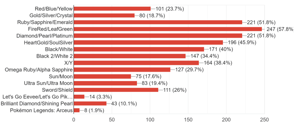 There’s also an error on my end that bears mentioning: FireRed/LeafGreen and Brilliant Diamond/Shining Pearl were briefly omitted from the list of answers of certain questions when the survey went live. This was fixed quickly, before the vast majority of responses were collected, and the impact on the results should be minimal, however, I apologize for the oversight. This has been fixed for the next iteration of the survey.