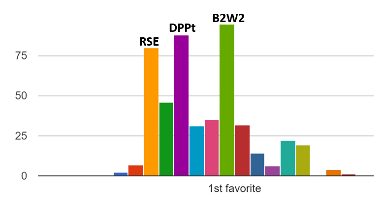 While Black 2/White 2 actually garnered the most first-place votes, the remainder of the rankings all went in favor of the original Sinnoh games and they take the top spot as the community’s favorite games to Nuzlocke. In terms of first-place votes, the top three ran away from the rest of the pack, with the third-place finisher Ruby/Sapphire/Emerald nearly doubling the fourth-place FireRed/LeafGreen in that category. So while in aggregate the community has varied preferences across all the generations, it’s clear that when it comes to people’s very favorite games, the community opinion is a lot more centralized and consistent. To show this even more clearly, let’s look at a chart showing the distribution of first-place votes: