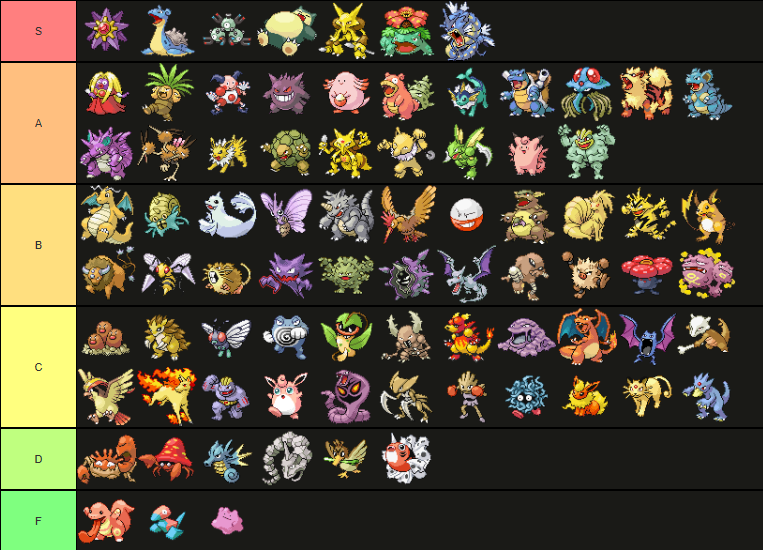 F-tier: These Pokémon are prohibitively bad, having poor stats, typing, and movepools. They should be replaced as soon as possible, and players should avoid using them, even in situations where they have a type advantage. These Pokémon will not be found on effective Nuzlocke teams.